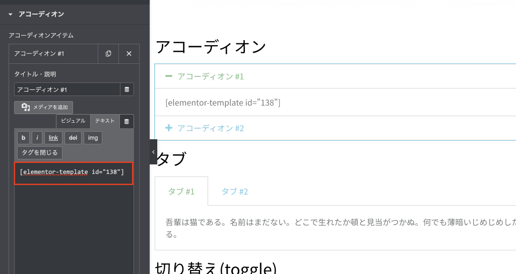 Elementor(エレメンター)を使っていて、基本機能だけではできない・実施が難しい場合があります。アコーディオンやタブ、トグルコンテンツといった「切り替えができるコンテンツ」は通常、テキストしか表示できません。そうなると表現の幅が狭くなってしまうので、できる方法を探した所、テンプレートとして保存し生成されたショートコードを利用することでうまく動作しましたのでご紹介します。